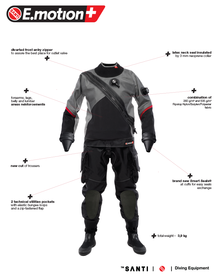 חיתוך מיוחד של ריפוד המפשעה, מאפשר תנועת רגליים נוחה. ה E.Motion PLUS מצויידת ברוכסן YKK אטום למים, עמיד, גמיש וקל משקל. הוא עמיד במיוחד ללכלוך ודורש תחזוקה קלה לפני ואחרי צלילות. SANTI מציעה שנתיים אחריות על הרוכסן.