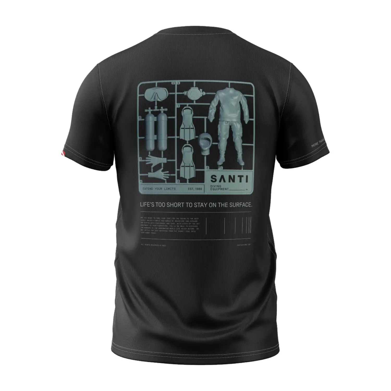 ה־Play של Santi היא חולצת T יוניסקס עם הדפס תלת־ממדי בצבע טורקיז של ציוד צלילה –